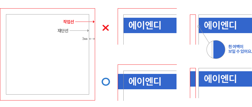 재단사이즈(완성된 인쇄물)에 여유분을 포함한 크기 인쇄 후 재단하는 과정에서 오차가 발생하여 인쇄되지 않은 영역이 보일 수 있습니다. 디자인, 사진 이미지, 바탕 전체에 칼라가 인쇄된 경우에 작업사이즈까지 채워져 있지 않고 재단사이즈 까지만 채워져 있으면 재단 후 흰색 종이면이 남을 수 있습니다.